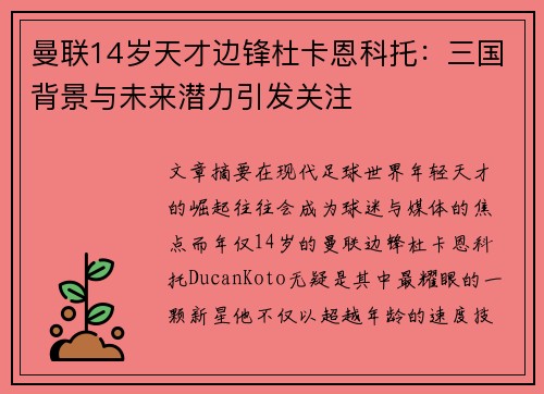 在足球转会市场上,米兰与霍伊伦之间的传闻引发了广泛关注。根据知名记者罗马诺的报道,米兰俱乐部与霍伊伦的经纪人已开始了直接接触,商谈转会事宜。这一消息为米兰的夏季转会窗口注入了新的变数,同时也让霍伊伦成为了欧洲足坛的焦点。本文将从四个方面详细探讨这一消息的背景、影响以及可能的未来发展。首先,我们将分析米兰为何对霍伊伦产生兴趣,其次,探讨霍伊伦在转会市场中的价值,接着分析米兰在转会中面临的挑战与机遇,...